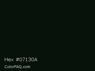 Hex #07130a Color is a almost black green color and the nearest color is Gordons Green #0b1107. Hex code #07130a and RGB value is rgb(7,19,10). In RGB color space, this color is composed of 3% red, 7% green, 4% blue, In CMYK color space, this color is composed of 63% cyan, 0% magenta, 47% yellow , 93% black , In HSL color space, this color has a hue angle of 135° , 46% saturation and 5% lightness.