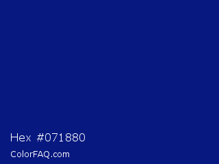 Hex #071880 Color is a dark blue color and the nearest color is Dark Imperial Blue #00147e. Hex code #071880 and RGB value is rgb(7,24,128). In RGB color space, this color is composed of 3% red, 9% green, 50% blue, In CMYK color space, this color is composed of 95% cyan, 81% magenta, 0% yellow , 50% black , In HSL color space, this color has a hue angle of 232° , 90% saturation and 26% lightness.