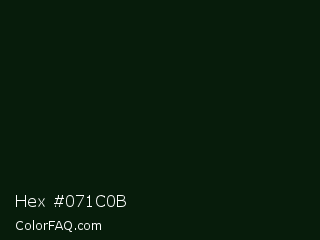 Hex #071c0b Color is a almost black green color and the nearest color is Black Bean #081910. Hex code #071c0b and RGB value is rgb(7,28,11). In RGB color space, this color is composed of 3% red, 11% green, 4% blue, In CMYK color space, this color is composed of 75% cyan, 0% magenta, 61% yellow , 89% black , In HSL color space, this color has a hue angle of 131° , 60% saturation and 7% lightness.