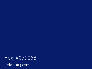 Hex #071c6b Color is a very dark blue color and the nearest color is Deep Sapphire #082567. Hex code #071c6b and RGB value is rgb(7,28,107). In RGB color space, this color is composed of 3% red, 11% green, 42% blue, In CMYK color space, this color is composed of 93% cyan, 74% magenta, 0% yellow , 58% black , In HSL color space, this color has a hue angle of 227° , 88% saturation and 22% lightness.