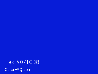Hex #071cd8 Color is a normal blue color and the nearest color is Medium Blue #0000cd. Hex code #071cd8 and RGB value is rgb(7,28,216). In RGB color space, this color is composed of 3% red, 11% green, 85% blue, In CMYK color space, this color is composed of 97% cyan, 87% magenta, 0% yellow , 15% black , In HSL color space, this color has a hue angle of 234° , 94% saturation and 44% lightness.