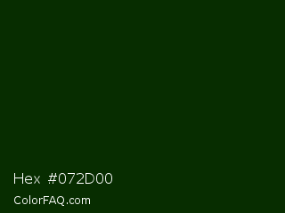 Hex #072d00 Color is a almost black green color and the nearest color is Deep Fir #002900. Hex code #072d00 and RGB value is rgb(7,45,0). In RGB color space, this color is composed of 3% red, 18% green, 0% blue, In CMYK color space, this color is composed of 84% cyan, 0% magenta, 100% yellow , 82% black , In HSL color space, this color has a hue angle of 111° , 100% saturation and 9% lightness.