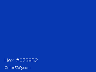 Hex #0738b2 Color is a normal blue color and the nearest color is UA Blue #0033aa. Hex code #0738b2 and RGB value is rgb(7,56,178). In RGB color space, this color is composed of 3% red, 22% green, 70% blue, In CMYK color space, this color is composed of 96% cyan, 69% magenta, 0% yellow , 30% black , In HSL color space, this color has a hue angle of 223° , 92% saturation and 36% lightness.
