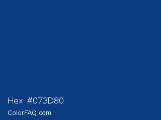 Hex #073d80 Color is a dark blue color and the nearest color is Dark Cerulean #08457e. Hex code #073d80 and RGB value is rgb(7,61,128). In RGB color space, this color is composed of 3% red, 24% green, 50% blue, In CMYK color space, this color is composed of 95% cyan, 52% magenta, 0% yellow , 50% black , In HSL color space, this color has a hue angle of 213° , 90% saturation and 26% lightness.