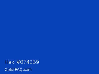 Hex #0742b9 Color is a normal blue color and the nearest color is Absolute Zero #0048ba. Hex code #0742b9 and RGB value is rgb(7,66,185). In RGB color space, this color is composed of 3% red, 26% green, 73% blue, In CMYK color space, this color is composed of 96% cyan, 64% magenta, 0% yellow , 27% black , In HSL color space, this color has a hue angle of 220° , 93% saturation and 38% lightness.