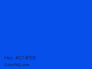 Hex #074feb Color is a normal blue color and the nearest color is Blue RYB #0247fe. Hex code #074feb and RGB value is rgb(7,79,235). In RGB color space, this color is composed of 3% red, 31% green, 92% blue, In CMYK color space, this color is composed of 97% cyan, 66% magenta, 0% yellow , 8% black , In HSL color space, this color has a hue angle of 221° , 94% saturation and 47% lightness.