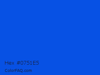 Hex #0751e5 Color is a normal blue color and the nearest color is Blue RYB #0247fe. Hex code #0751e5 and RGB value is rgb(7,81,229). In RGB color space, this color is composed of 3% red, 32% green, 90% blue, In CMYK color space, this color is composed of 97% cyan, 65% magenta, 0% yellow , 10% black , In HSL color space, this color has a hue angle of 220° , 94% saturation and 46% lightness.
