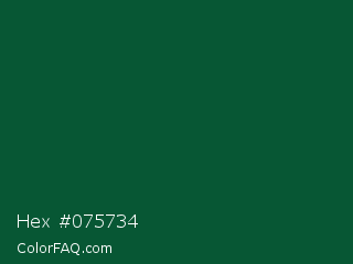 Hex #075734 Color is a very dark green color and the nearest color is Sacramento State Green #00563f. Hex code #075734 and RGB value is rgb(7,87,52). In RGB color space, this color is composed of 3% red, 34% green, 20% blue, In CMYK color space, this color is composed of 92% cyan, 0% magenta, 40% yellow , 66% black , In HSL color space, this color has a hue angle of 154° , 85% saturation and 18% lightness.