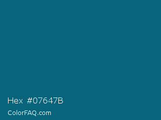 Hex #07647b Color is a dark cyan color and the nearest color is Blue Sapphire #126180. Hex code #07647b and RGB value is rgb(7,100,123). In RGB color space, this color is composed of 3% red, 39% green, 48% blue, In CMYK color space, this color is composed of 94% cyan, 19% magenta, 0% yellow , 52% black , In HSL color space, this color has a hue angle of 192° , 89% saturation and 25% lightness.