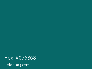 Hex #076868 Color is a very dark cyan color and the nearest color is Mosque #036a6e. Hex code #076868 and RGB value is rgb(7,104,104). In RGB color space, this color is composed of 3% red, 41% green, 41% blue, In CMYK color space, this color is composed of 93% cyan, 0% magenta, 0% yellow , 59% black , In HSL color space, this color has a hue angle of 180° , 87% saturation and 22% lightness.