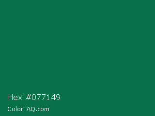 Hex #077149 Color is a dark green color and the nearest color is Bottle Green #006a4e. Hex code #077149 and RGB value is rgb(7,113,73). In RGB color space, this color is composed of 3% red, 44% green, 29% blue, In CMYK color space, this color is composed of 94% cyan, 0% magenta, 35% yellow , 56% black , In HSL color space, this color has a hue angle of 157° , 88% saturation and 24% lightness.