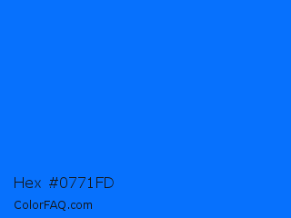 Hex #0771fd Color is a normal blue color and the nearest color is Brandeis Blue #0070ff. Hex code #0771fd and RGB value is rgb(7,113,253). In RGB color space, this color is composed of 3% red, 44% green, 99% blue, In CMYK color space, this color is composed of 97% cyan, 55% magenta, 0% yellow , 1% black , In HSL color space, this color has a hue angle of 214° , 98% saturation and 51% lightness.