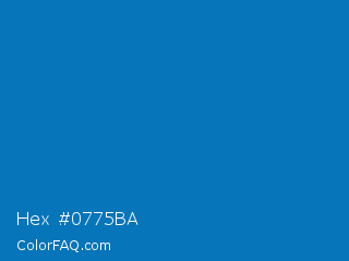 Hex #0775ba Color is a normal blue color and the nearest color is French Blue #0072bb. Hex code #0775ba and RGB value is rgb(7,117,186). In RGB color space, this color is composed of 3% red, 46% green, 73% blue, In CMYK color space, this color is composed of 96% cyan, 37% magenta, 0% yellow , 27% black , In HSL color space, this color has a hue angle of 203° , 93% saturation and 38% lightness.