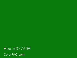 Hex #077a0b Color is a dark green color and the nearest color is Office Green #008000. Hex code #077a0b and RGB value is rgb(7,122,11). In RGB color space, this color is composed of 3% red, 48% green, 4% blue, In CMYK color space, this color is composed of 94% cyan, 0% magenta, 91% yellow , 52% black , In HSL color space, this color has a hue angle of 122° , 89% saturation and 25% lightness.