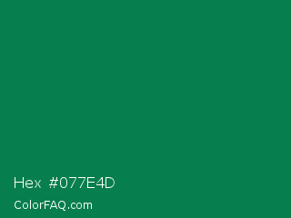 Hex #077e4d Color is a dark green color and the nearest color is Salem #097f4b. Hex code #077e4d and RGB value is rgb(7,126,77). In RGB color space, this color is composed of 3% red, 49% green, 30% blue, In CMYK color space, this color is composed of 94% cyan, 0% magenta, 39% yellow , 51% black , In HSL color space, this color has a hue angle of 155° , 89% saturation and 26% lightness.