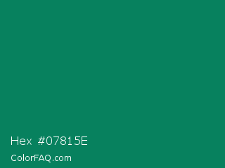 Hex #07815e Color is a dark green color and the nearest color is Spanish Viridian #007f5c. Hex code #07815e and RGB value is rgb(7,129,94). In RGB color space, this color is composed of 3% red, 51% green, 37% blue, In CMYK color space, this color is composed of 95% cyan, 0% magenta, 27% yellow , 49% black , In HSL color space, this color has a hue angle of 163° , 90% saturation and 27% lightness.