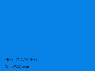 Hex #0782e6 Color is a normal blue color and the nearest color is Azure Radiance #007fff. Hex code #0782e6 and RGB value is rgb(7,130,230). In RGB color space, this color is composed of 3% red, 51% green, 90% blue, In CMYK color space, this color is composed of 97% cyan, 43% magenta, 0% yellow , 10% black , In HSL color space, this color has a hue angle of 207° , 94% saturation and 46% lightness.