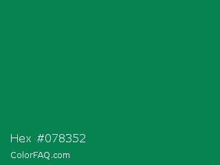 Hex #078352 Color is a dark green color and the nearest color is Salem #097f4b. Hex code #078352 and RGB value is rgb(7,131,82). In RGB color space, this color is composed of 3% red, 51% green, 32% blue, In CMYK color space, this color is composed of 95% cyan, 0% magenta, 37% yellow , 49% black , In HSL color space, this color has a hue angle of 156° , 90% saturation and 27% lightness.