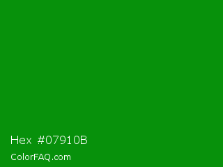 Hex #07910b Color is a dark green color and the nearest color is Islamic Green #009000. Hex code #07910b and RGB value is rgb(7,145,11). In RGB color space, this color is composed of 3% red, 57% green, 4% blue, In CMYK color space, this color is composed of 95% cyan, 0% magenta, 92% yellow , 43% black , In HSL color space, this color has a hue angle of 122° , 91% saturation and 30% lightness.