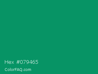 Hex #079465 Color is a dark green color and the nearest color is Green Cyan #009966. Hex code #079465 and RGB value is rgb(7,148,101). In RGB color space, this color is composed of 3% red, 58% green, 40% blue, In CMYK color space, this color is composed of 95% cyan, 0% magenta, 32% yellow , 42% black , In HSL color space, this color has a hue angle of 160° , 91% saturation and 30% lightness.