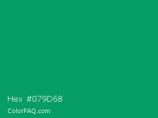 Hex #079d68 Color is a normal green color and the nearest color is Green NCS #009f6b. Hex code #079d68 and RGB value is rgb(7,157,104). In RGB color space, this color is composed of 3% red, 62% green, 41% blue, In CMYK color space, this color is composed of 96% cyan, 0% magenta, 34% yellow , 38% black , In HSL color space, this color has a hue angle of 159° , 91% saturation and 32% lightness.