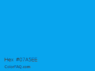 Hex #07a5ee Color is a normal blue color and the nearest color is Vivid Cerulean #00aaee. Hex code #07a5ee and RGB value is rgb(7,165,238). In RGB color space, this color is composed of 3% red, 65% green, 93% blue, In CMYK color space, this color is composed of 97% cyan, 31% magenta, 0% yellow , 7% black , In HSL color space, this color has a hue angle of 199° , 94% saturation and 48% lightness.