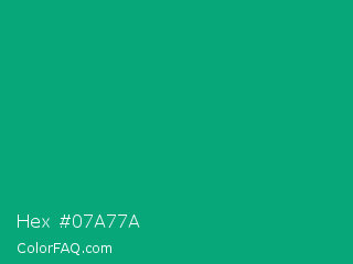 Hex #07a77a Color is a normal green color and the nearest color is Green Munsell #00a877. Hex code #07a77a and RGB value is rgb(7,167,122). In RGB color space, this color is composed of 3% red, 65% green, 48% blue, In CMYK color space, this color is composed of 96% cyan, 0% magenta, 27% yellow , 35% black , In HSL color space, this color has a hue angle of 163° , 92% saturation and 34% lightness.