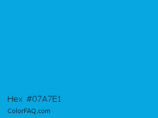 Hex #07a7e1 Color is a normal blue color and the nearest color is Vivid Cerulean #00aaee. Hex code #07a7e1 and RGB value is rgb(7,167,225). In RGB color space, this color is composed of 3% red, 65% green, 88% blue, In CMYK color space, this color is composed of 97% cyan, 26% magenta, 0% yellow , 12% black , In HSL color space, this color has a hue angle of 196° , 94% saturation and 45% lightness.