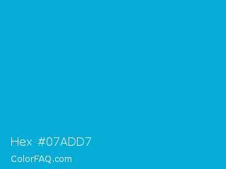 Hex #07add7 Color is a normal cyan color and the nearest color is Cerulean #02a4d3. Hex code #07add7 and RGB value is rgb(7,173,215). In RGB color space, this color is composed of 3% red, 68% green, 84% blue, In CMYK color space, this color is composed of 97% cyan, 20% magenta, 0% yellow , 16% black , In HSL color space, this color has a hue angle of 192° , 94% saturation and 44% lightness.