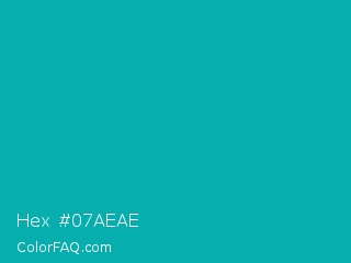 Hex #07aeae Color is a normal cyan color and the nearest color is Tiffany Blue #0abab5. Hex code #07aeae and RGB value is rgb(7,174,174). In RGB color space, this color is composed of 3% red, 68% green, 68% blue, In CMYK color space, this color is composed of 96% cyan, 0% magenta, 0% yellow , 32% black , In HSL color space, this color has a hue angle of 180° , 92% saturation and 35% lightness.