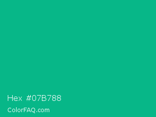 Hex #07b788 Color is a normal cyan color and the nearest color is Mountain Meadow Crayola #1ab385. Hex code #07b788 and RGB value is rgb(7,183,136). In RGB color space, this color is composed of 3% red, 72% green, 53% blue, In CMYK color space, this color is composed of 96% cyan, 0% magenta, 26% yellow , 28% black , In HSL color space, this color has a hue angle of 164° , 93% saturation and 37% lightness.