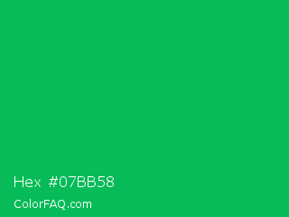 Hex #07bb58 Color is a normal green color and the nearest color is GO Green #00ab66. Hex code #07bb58 and RGB value is rgb(7,187,88). In RGB color space, this color is composed of 3% red, 73% green, 35% blue, In CMYK color space, this color is composed of 96% cyan, 0% magenta, 53% yellow , 27% black , In HSL color space, this color has a hue angle of 147° , 93% saturation and 38% lightness.