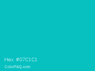Hex #07c1c1 Color is a normal cyan color and the nearest color is Tiffany Blue #0abab5. Hex code #07c1c1 and RGB value is rgb(7,193,193). In RGB color space, this color is composed of 3% red, 76% green, 76% blue, In CMYK color space, this color is composed of 96% cyan, 0% magenta, 0% yellow , 24% black , In HSL color space, this color has a hue angle of 180° , 93% saturation and 39% lightness.