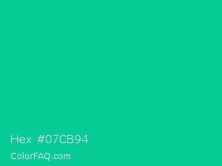 Hex #07cb94 Color is a normal green color and the nearest color is Caribbean Green #00cc99. Hex code #07cb94 and RGB value is rgb(7,203,148). In RGB color space, this color is composed of 3% red, 80% green, 58% blue, In CMYK color space, this color is composed of 97% cyan, 0% magenta, 27% yellow , 20% black , In HSL color space, this color has a hue angle of 163° , 93% saturation and 41% lightness.