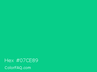 Hex #07ce89 Color is a normal green color and the nearest color is Caribbean Green #00cc99. Hex code #07ce89 and RGB value is rgb(7,206,137). In RGB color space, this color is composed of 3% red, 81% green, 54% blue, In CMYK color space, this color is composed of 97% cyan, 0% magenta, 33% yellow , 19% black , In HSL color space, this color has a hue angle of 159° , 93% saturation and 42% lightness.