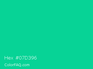 Hex #07d396 Color is a normal green color and the nearest color is Caribbean Green #00cc99. Hex code #07d396 and RGB value is rgb(7,211,150). In RGB color space, this color is composed of 3% red, 83% green, 59% blue, In CMYK color space, this color is composed of 97% cyan, 0% magenta, 29% yellow , 17% black , In HSL color space, this color has a hue angle of 162° , 94% saturation and 43% lightness.