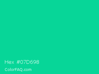 Hex #07d698 Color is a normal green color and the nearest color is Caribbean Green #00cc99. Hex code #07d698 and RGB value is rgb(7,214,152). In RGB color space, this color is composed of 3% red, 84% green, 60% blue, In CMYK color space, this color is composed of 97% cyan, 0% magenta, 29% yellow , 16% black , In HSL color space, this color has a hue angle of 162° , 94% saturation and 43% lightness.