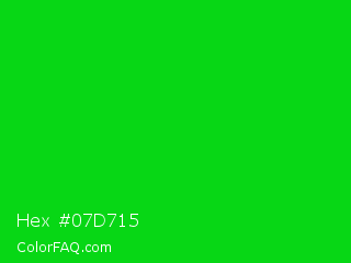Hex #07d715 Color is a normal green color and the nearest color is Vivid Malachite #00cc33. Hex code #07d715 and RGB value is rgb(7,215,21). In RGB color space, this color is composed of 3% red, 84% green, 8% blue, In CMYK color space, this color is composed of 97% cyan, 0% magenta, 90% yellow , 16% black , In HSL color space, this color has a hue angle of 124° , 94% saturation and 44% lightness.