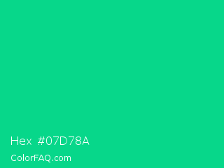 Hex #07d78a Color is a normal green color and the nearest color is Caribbean Green #00cc99. Hex code #07d78a and RGB value is rgb(7,215,138). In RGB color space, this color is composed of 3% red, 84% green, 54% blue, In CMYK color space, this color is composed of 97% cyan, 0% magenta, 36% yellow , 16% black , In HSL color space, this color has a hue angle of 158° , 94% saturation and 44% lightness.