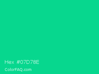 Hex #07d78e Color is a normal green color and the nearest color is Caribbean Green #00cc99. Hex code #07d78e and RGB value is rgb(7,215,142). In RGB color space, this color is composed of 3% red, 84% green, 56% blue, In CMYK color space, this color is composed of 97% cyan, 0% magenta, 34% yellow , 16% black , In HSL color space, this color has a hue angle of 159° , 94% saturation and 44% lightness.