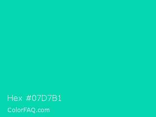 Hex #07d7b1 Color is a normal cyan color and the nearest color is Amazonite #00c4b0. Hex code #07d7b1 and RGB value is rgb(7,215,177). In RGB color space, this color is composed of 3% red, 84% green, 69% blue, In CMYK color space, this color is composed of 97% cyan, 0% magenta, 18% yellow , 16% black , In HSL color space, this color has a hue angle of 169° , 94% saturation and 44% lightness.