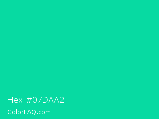 Hex #07daa2 Color is a normal cyan color and the nearest color is Caribbean Green #00cc99. Hex code #07daa2 and RGB value is rgb(7,218,162). In RGB color space, this color is composed of 3% red, 85% green, 64% blue, In CMYK color space, this color is composed of 97% cyan, 0% magenta, 26% yellow , 15% black , In HSL color space, this color has a hue angle of 164° , 94% saturation and 44% lightness.