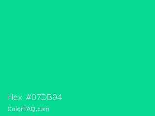 Hex #07db94 Color is a normal green color and the nearest color is Caribbean Green #00cc99. Hex code #07db94 and RGB value is rgb(7,219,148). In RGB color space, this color is composed of 3% red, 86% green, 58% blue, In CMYK color space, this color is composed of 97% cyan, 0% magenta, 32% yellow , 14% black , In HSL color space, this color has a hue angle of 160° , 94% saturation and 44% lightness.