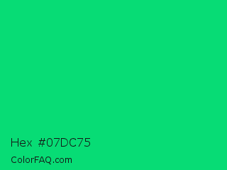 Hex #07dc75 Color is a normal green color and the nearest color is Malachite #0bda51. Hex code #07dc75 and RGB value is rgb(7,220,117). In RGB color space, this color is composed of 3% red, 86% green, 46% blue, In CMYK color space, this color is composed of 97% cyan, 0% magenta, 47% yellow , 14% black , In HSL color space, this color has a hue angle of 151° , 94% saturation and 45% lightness.