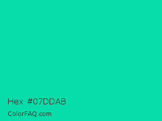 Hex #07ddab Color is a normal cyan color and the nearest color is Caribbean Green #00cc99. Hex code #07ddab and RGB value is rgb(7,221,171). In RGB color space, this color is composed of 3% red, 87% green, 67% blue, In CMYK color space, this color is composed of 97% cyan, 0% magenta, 23% yellow , 13% black , In HSL color space, this color has a hue angle of 166° , 94% saturation and 45% lightness.