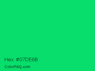 Hex #07de6b Color is a normal green color and the nearest color is Malachite #0bda51. Hex code #07de6b and RGB value is rgb(7,222,107). In RGB color space, this color is composed of 3% red, 87% green, 42% blue, In CMYK color space, this color is composed of 97% cyan, 0% magenta, 52% yellow , 13% black , In HSL color space, this color has a hue angle of 148° , 94% saturation and 45% lightness.