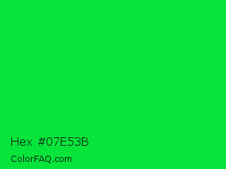 Hex #07e53b Color is a normal green color and the nearest color is Malachite #0bda51. Hex code #07e53b and RGB value is rgb(7,229,59). In RGB color space, this color is composed of 3% red, 90% green, 23% blue, In CMYK color space, this color is composed of 97% cyan, 0% magenta, 74% yellow , 10% black , In HSL color space, this color has a hue angle of 134° , 94% saturation and 46% lightness.
