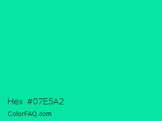 Hex #07e5a2 Color is a normal green color and the nearest color is Medium Spring Green #00fa9a. Hex code #07e5a2 and RGB value is rgb(7,229,162). In RGB color space, this color is composed of 3% red, 90% green, 64% blue, In CMYK color space, this color is composed of 97% cyan, 0% magenta, 29% yellow , 10% black , In HSL color space, this color has a hue angle of 162° , 94% saturation and 46% lightness.