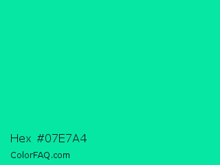 Hex #07e7a4 Color is a normal green color and the nearest color is Medium Spring Green #00fa9a. Hex code #07e7a4 and RGB value is rgb(7,231,164). In RGB color space, this color is composed of 3% red, 91% green, 64% blue, In CMYK color space, this color is composed of 97% cyan, 0% magenta, 29% yellow , 9% black , In HSL color space, this color has a hue angle of 162° , 94% saturation and 47% lightness.