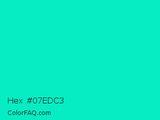 Hex #07edc3 Color is a normal cyan color and the nearest color is Bright Turquoise #08e8de. Hex code #07edc3 and RGB value is rgb(7,237,195). In RGB color space, this color is composed of 3% red, 93% green, 76% blue, In CMYK color space, this color is composed of 97% cyan, 0% magenta, 18% yellow , 7% black , In HSL color space, this color has a hue angle of 169° , 94% saturation and 48% lightness.